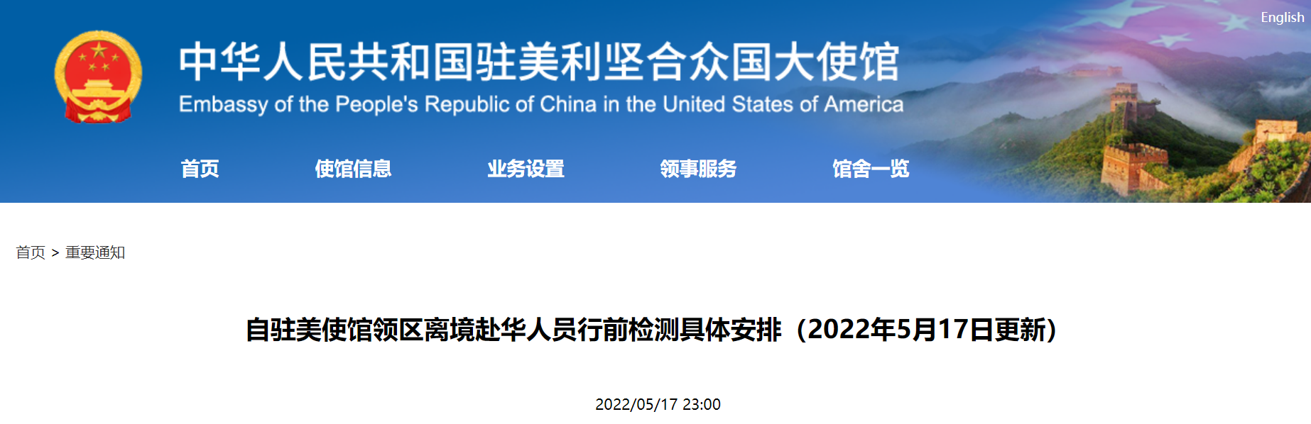 5月17日,中國駐美大使館及中國駐舊金山總領館、駐紐約總領館、駐洛杉磯總領館更新赴華人員行前檢測最新具體安排。