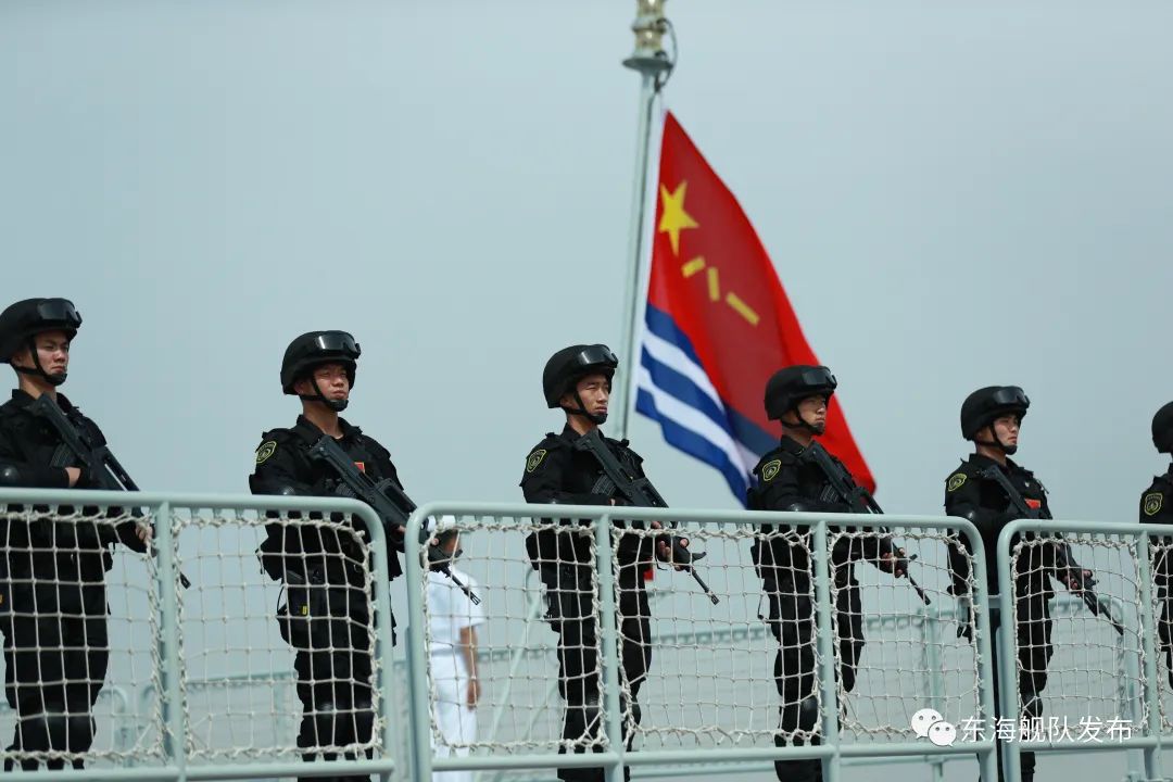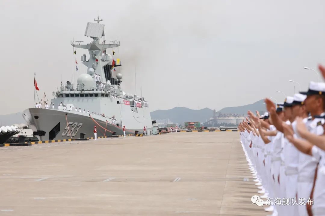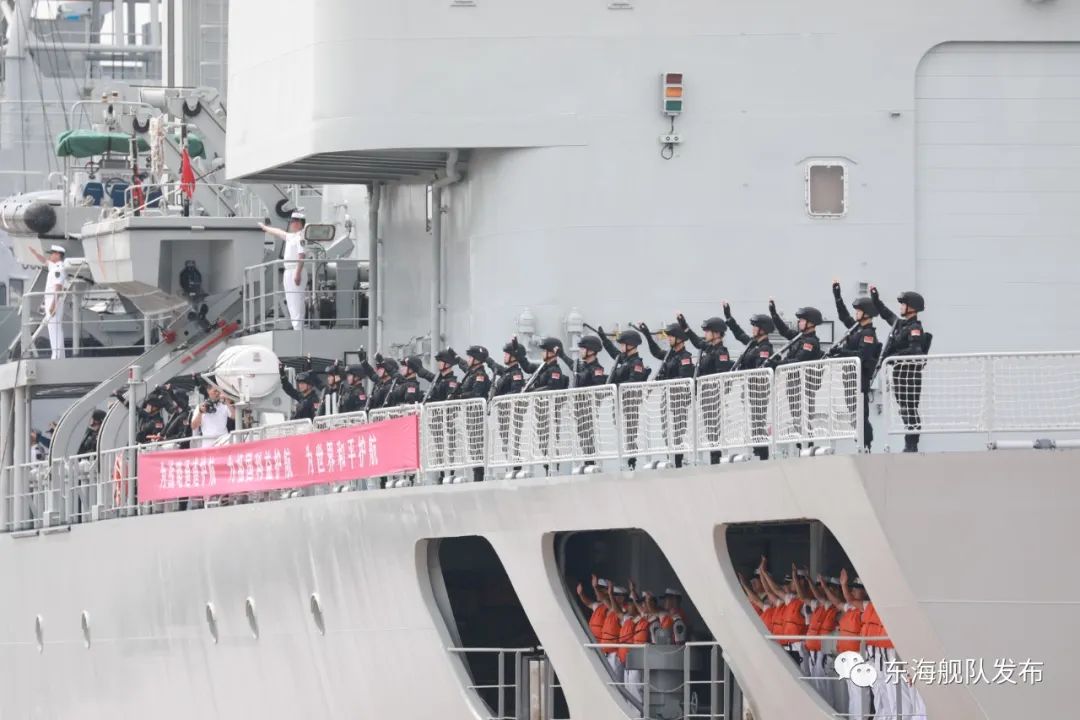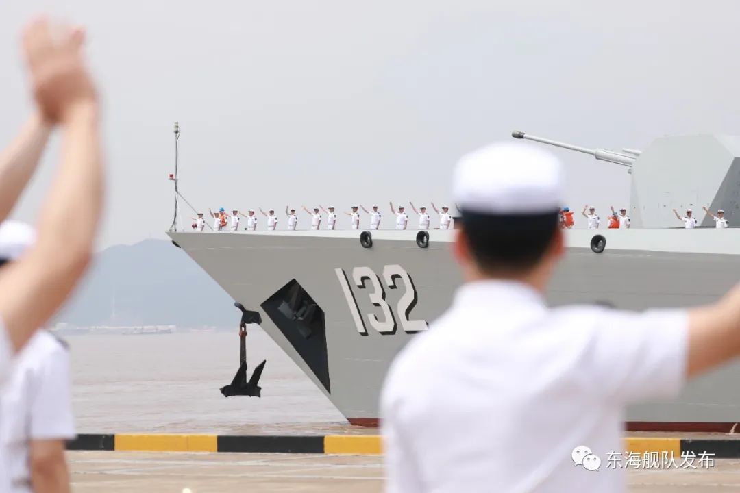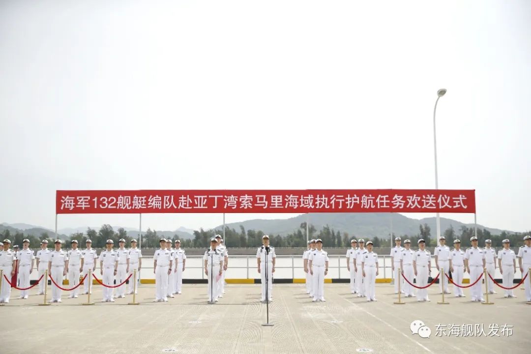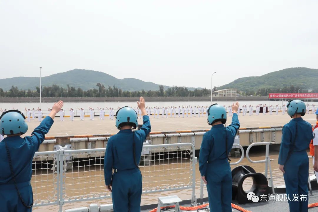 9時許,東部戰區海軍在碼頭,為護航編隊舉行歡送儀式。在編隊指揮員請示起航後,伴隨着嘹亮的軍樂聲,編隊艦艇依次緩緩駛離碼頭。甲板上,任務官兵精神抖擻,整齊列隊,揮手告別。