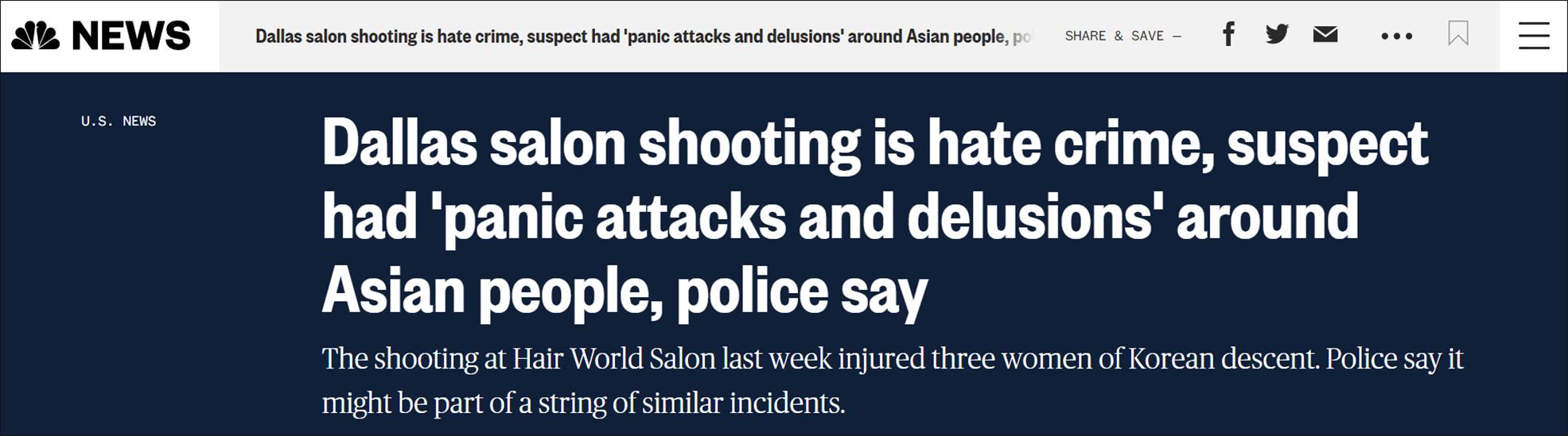 美國全國廣播公司(NBC):警方説,達拉斯髮廊槍擊案是仇恨犯罪,嫌疑人對亞裔有“恐慌和妄想”