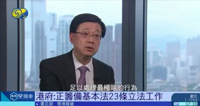 2021年7月,時任香港政務司司長的李家超接受採訪時表示,正籌備基本法23條立法工作,圖片來源:鳳凰衞視視頻截圖