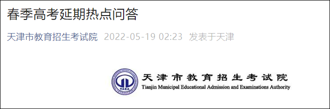 此前,5月18日,天津市教育招生考試院發佈通知稱,天津市2022年春季高考(面向普通高中畢業生、面向中職畢業生)將調整到6月12日舉行。