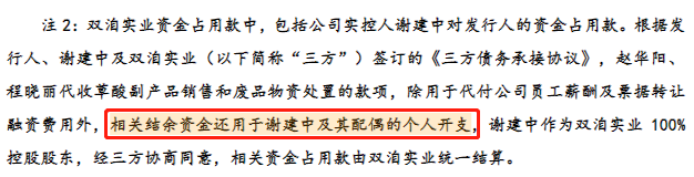 對於上述關聯公司佔用新天地藥業資金的具體細節,招股書中並未詳細説明,僅説明了雙洎實業資金佔用款的用途。招股書顯示,雙洎實業的“借款”除用於代付公司員工薪酬及票據轉讓融資費用外,相關結餘資金還用於謝建中及其配偶的個人開支。