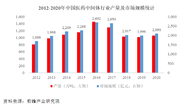 前瞻產業研究院數據顯示,中國醫藥中間體行業市場規模由2016年的高峯2692億元下降至2019年的1996億元,2020年略有回暖至2090億元。