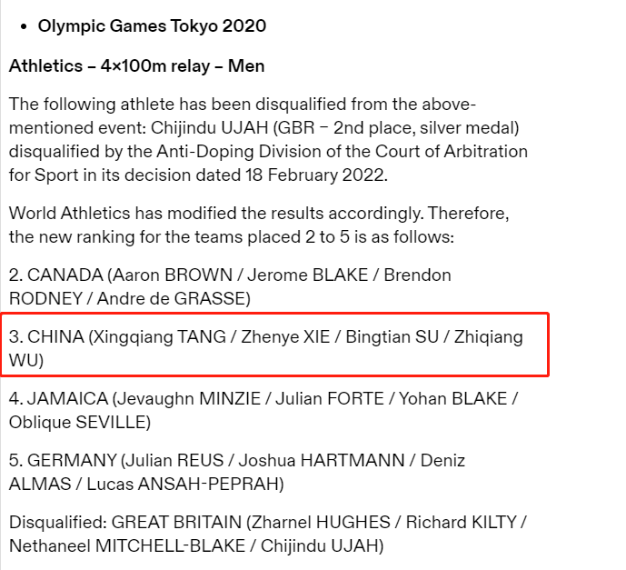 國際體育仲裁法庭(CAS)今年2月18日發佈公告,認定英國短跑運動員奇金杜·烏賈在東京奧運會期間違反了反興奮劑條例,烏賈在東京奧運會男子4×100米接力決賽和男子100米比賽中取得的成績都被取消,英國隊在東京奧運會男子4×100米接力決賽中獲得的銀牌也被剝奪。加拿大隊遞補獲得銀牌,中國隊遞補獲得銅牌。這也是中國男子4×100米接力隊在奧運會上獲得的首枚獎牌。