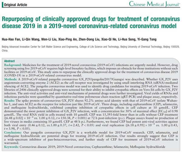 5月13日,微信公眾號“北京化工大學”轉載《科技日報》頭版報道:該校生命科學與技術學院童貽剛教授團隊發現新冠治療新藥千金藤素,並獲得發明專利授權。專利説明顯示,10uM(微摩爾/升)的千金藤素抑制冠狀病毒複製的倍數為15393倍。