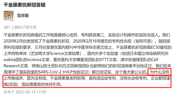 千金藤素專利的另一個申請者範華昊教授坦言:“為什麼沒有上市推臨牀,因為沒有錢。千金藤素是老藥新用,雖有適應症專利,沒有化合物專利。企業都很謹慎,因此需要政府扶持引導。”