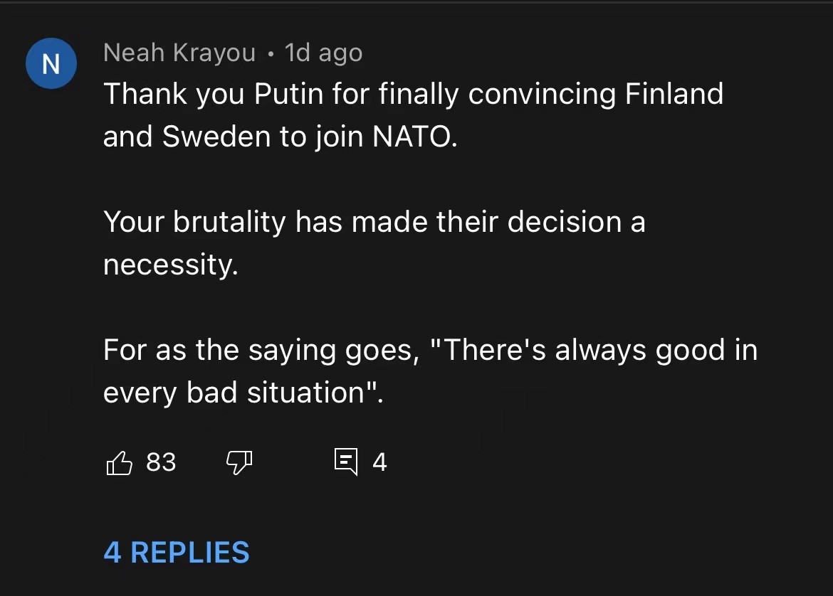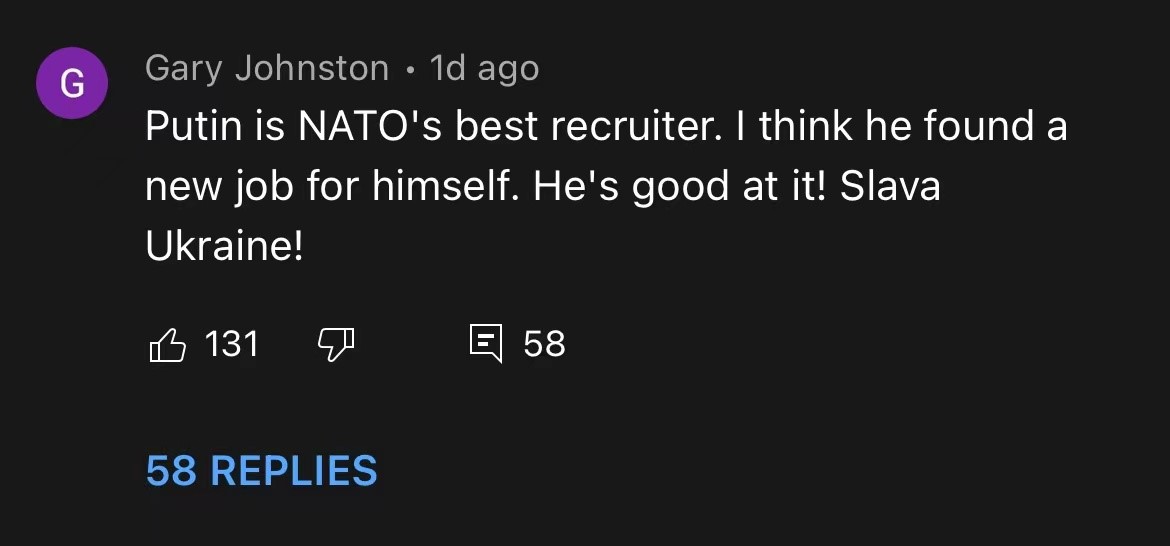 實際上有很多人在説“謝謝弗拉基米爾·普京拯救北約”“俄羅斯干得好,讓北約一天天變強了”。這些網友們的看法是,儘管北約在烏克蘭戰爭之前在歐洲有許多成員,但大多數美國人積極參與並向北約投入資金。美國花了過去20年的時間試圖説服歐洲國家提高他們的軍事水平,更多地參與北約並投入更多的資金,但歐洲人對增加軍事投資沒有多大興趣。然而,俄羅斯對烏克蘭的攻擊改變了一切。