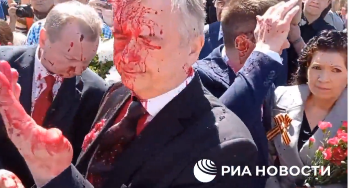 俄羅斯駐波蘭大使被潑紅色染料,圖源:俄新社視頻截圖