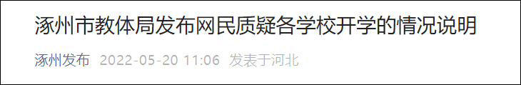 5月20日,“涿州發佈”微信公眾號發佈涿州市教體局發佈網民質疑各學校開學的情況説明,內容如下: