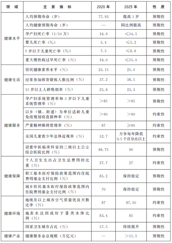 (三)發展目標。到2025年,衞生健康體系更加完善,中國特色基本醫療衞生制度逐步健全,重大疫情和突發公共衞生事件防控應對能力顯著提升,中醫藥獨特優勢進一步發揮,健康科技創新能力明顯增強,人均預期壽命在2020年基礎上繼續提高1歲左右,人均健康預期壽命同比例提高。
