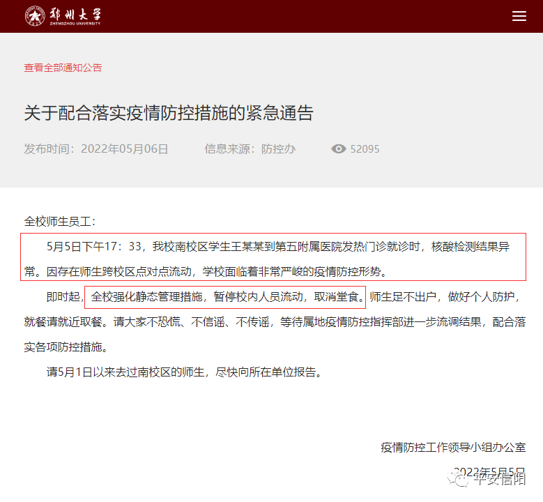 5月6日,鄭州大學發佈了《關於配合疫情防控措施的緊急通告》。通告中表示,5月5日,鄭州大學南校區一名學生在發熱門診就診時,核酸檢測結果異常。