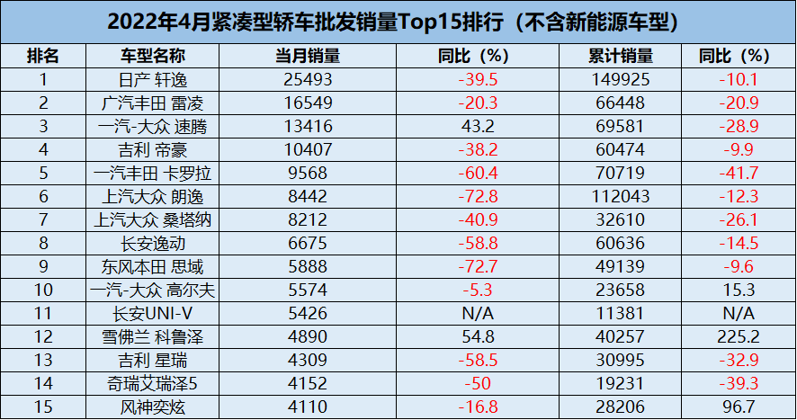 而作為轎車市場的支柱,緊湊型車市場在4月受到的打擊同樣嚴重,受制於產能端的限制,緊湊型轎車整體在市場中同比下滑36.9%,從榜單排名上來看,身處榜單前列的車企下滑幅度尤為明顯。