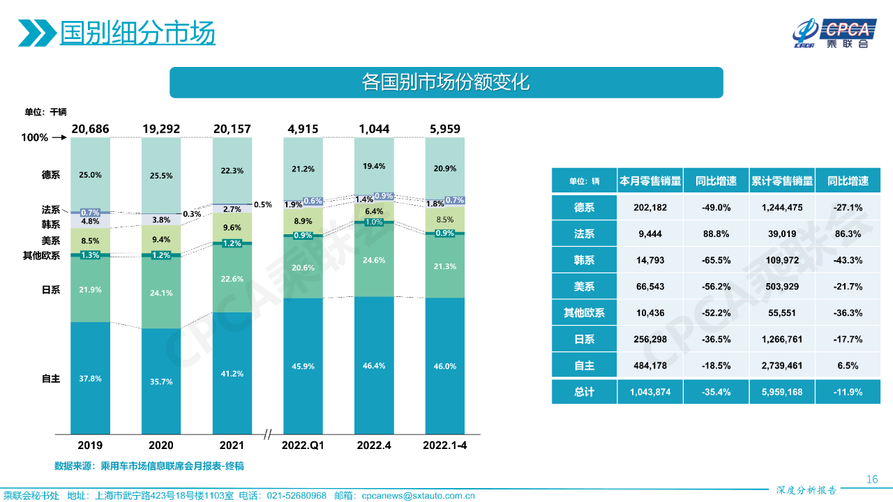 由於豪華品牌的市場佔有率較高,中大型車市場在4月同樣嚴重受到消費市場慾望下滑的影響。乘聯會分析,俄烏戰爭、油價上漲,疫情影響所導致的經濟受損,已經開始逐漸影響消費市場,尤其是高端汽車消費階層的慾望。這一推測在4月的中大型車市場銷量上已經有所展現。