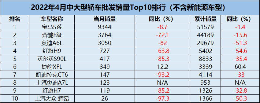 4月除寶馬5系和捷豹XFL兩款車型外,其餘上榜車型的同比跌幅均超過60%,平均跌幅更是高達82.7%。顯然,如此程度的銷量下滑,已經不僅源自於疫情之下的產能和市場封鎖。在1-4月累計銷量的同比數據上,中大型車也呈現出較大幅度的同比下滑態勢,無不在證明同級市場消費慾望下降的趨勢。