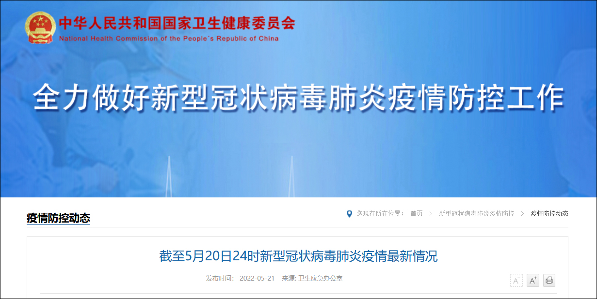 據國家衞健委網站21日消息,5月20日0—24時,31個省(自治區、直轄市)和新疆生產建設兵團報告新增確診病例201例。其中境外輸入病例20例(福建9例,廣東4例,江蘇2例,廣西2例,四川2例,浙江1例),含1例由無症狀感染者轉為確診病例(在浙江);本土病例181例(上海84例,北京58例,四川32例,天津6例,河南1例),含66例由無症狀感染者轉為確診病例(上海49例,四川15例,北京2例)。新增死亡病例1例,為本土病例,在上海;無新增疑似病例。