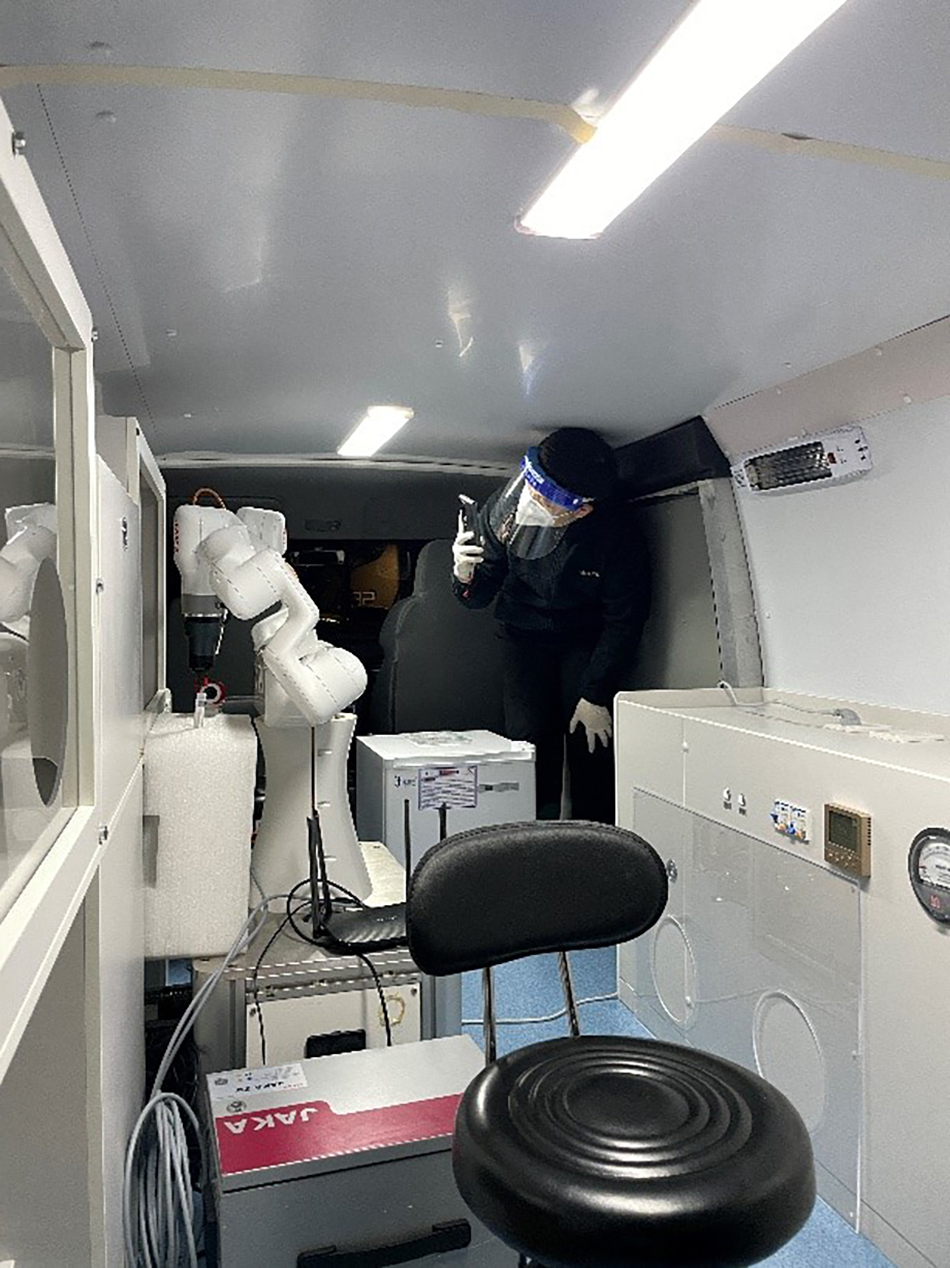 閆維新介紹,小小一台車內大有乾坤。其中一共包括四大部分:一是改裝的採樣車,其中包含了與採樣相關的設施、機電系統、冰箱、氣壓控制系統;其二,雙臂機器人,來自節卡機器人公司的機械雙臂協作完成採樣、擰管等一系列工作;其三,消殺系統,採樣前後進行整體的消殺處理;其四,大數據系統,包括掃碼、採樣,以及之後每個標籤和人的一一對應,以形成的大數據存儲。