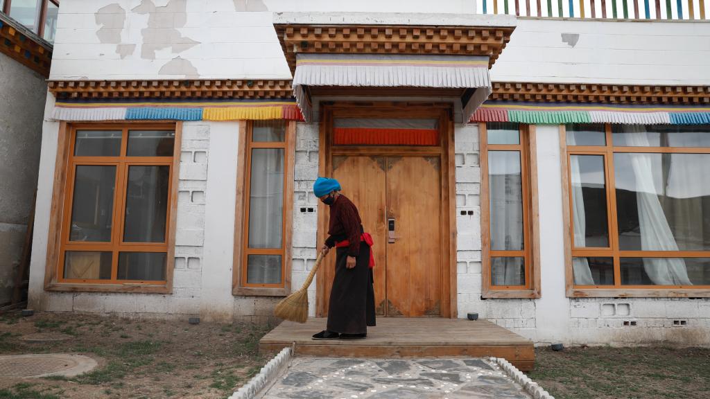 俄合拉村村民旦知草在自家的民宿前打掃衞生。新華社記者 任延昕 攝