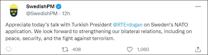 埃爾多安在21日的通話中告訴瑞典總理瑪格達萊娜·安德松,土耳其希望瑞典採取具體、嚴肅的措施來解決土方(對恐怖組織)的擔憂。埃爾多安説:“瑞典必須停止對‘恐怖組織’的政治、經濟和武器的支持 ”。埃爾多安還表示,應該取消土耳其在2019年出兵敍利亞後被實施的武器出口禁運措施。
