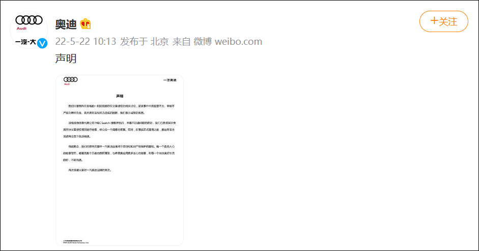 值得一提的是,今日下午,奧迪小滿廣告創意代理方M&CSaatchi上思廣告也通過官方微信公眾號發佈一則聲明,回應此事。