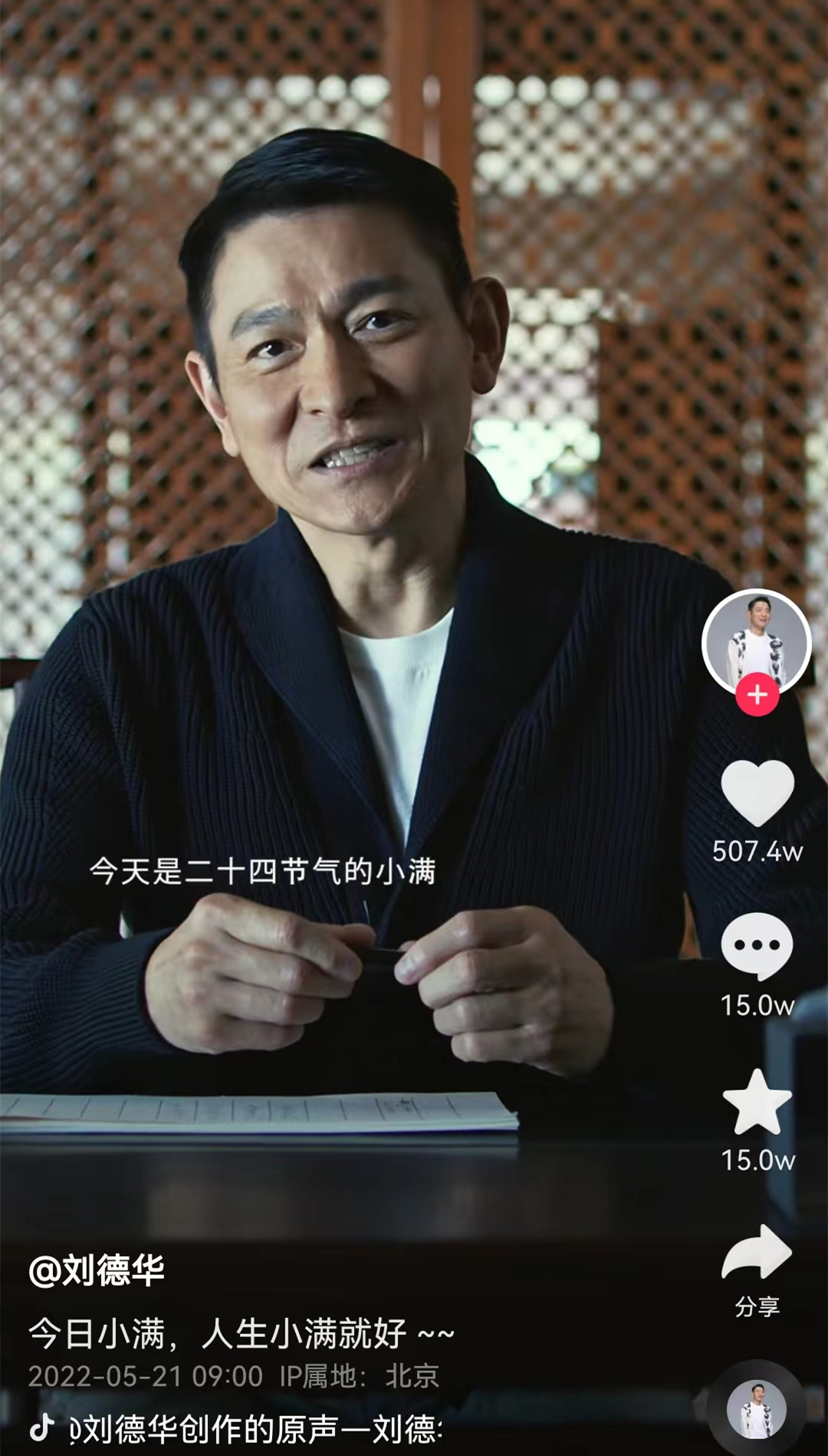 此外,“北大滿哥”在視頻中吟的詩,“花未全開月未圓,半山微醉盡餘歡,何須多慮盈虧事,終歸小滿勝萬全”,也由劉德華在《人生小滿》廣告片中吟誦出來。