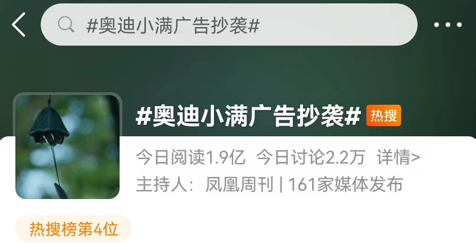 在“北大滿哥”的這條指控視頻發佈後,奧迪《人生小滿》廣告面臨的爭議越來越大,#奧迪小滿廣告抄襲#話題也於今日上午登上熱搜,閲讀量破億。
