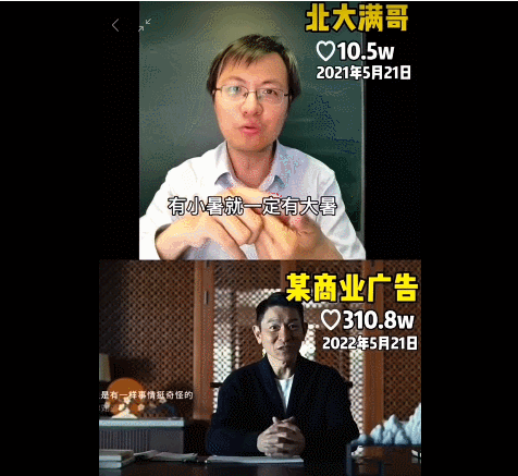 除了開頭外,出現在《人生小滿》廣告片中“小滿的這一天麥穗開始逐漸飽滿,但是還沒有完全飽滿”“小滿代表了一種人生態度,就是我們一直在追求完美的路上,但並不要求一定要十全十美”“所以從這個角度小滿其實是一年中最好的一個節氣,也是我最喜歡的日子”等文案,也幾乎與“北大滿哥”的視頻文案完全相同。