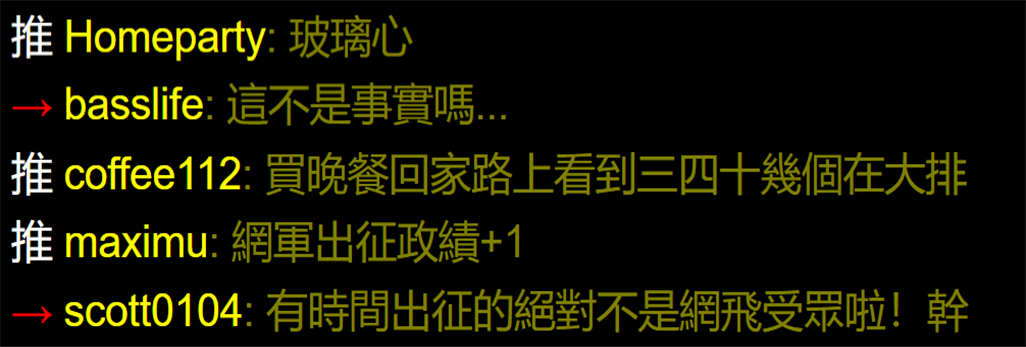 另外,許多人還認為“出征”網飛的網民與綠營網軍脱不了干係,並嘲諷他們太過“玻璃心”。就連島內親綠論壇PTT上也有人譏諷稱,綠營網軍“出征政績+1”。
