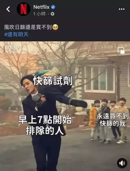 不過,網飛利用台灣快篩試劑一劑難求的梗,對這一片段進行了二次創作:被抱走的小孩身上標註了文字“快篩試劑”,抱走孩子的男子身上寫着“早上7點開始排隊的人”,而留在原地的孩童則寫上了“永遠買不到快篩的我”。另外,這條臉書視頻還配文道:“風吹日篩(曬)還是買不到(哭臉),#還有明天。”