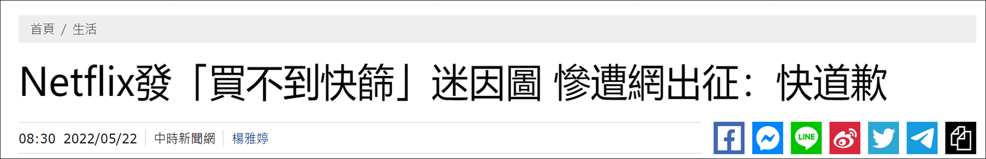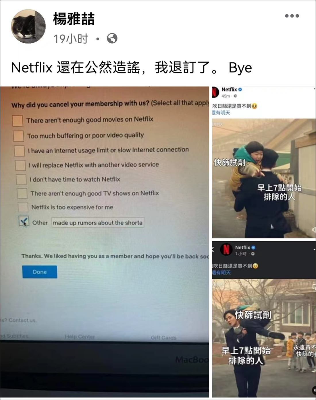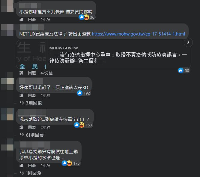 台灣聯合新聞網22日也稱,網飛似乎在暗酸台灣防疫不力,嘲笑民眾仍買不到快篩試劑,引來網民正反面論戰。而且,由於該帖文已被網飛刪除,還有網民轉戰網飛另一條宣傳帖文下留言,要求網飛官方出面説明。據報道,有人怒氣衝衝地質問網飛,“哈囉你們的危機處理是僅刪文而已不道歉?”還有人揚言退訂,“我已退訂。不尊重客户,羞辱客户,還有什麼好説。”