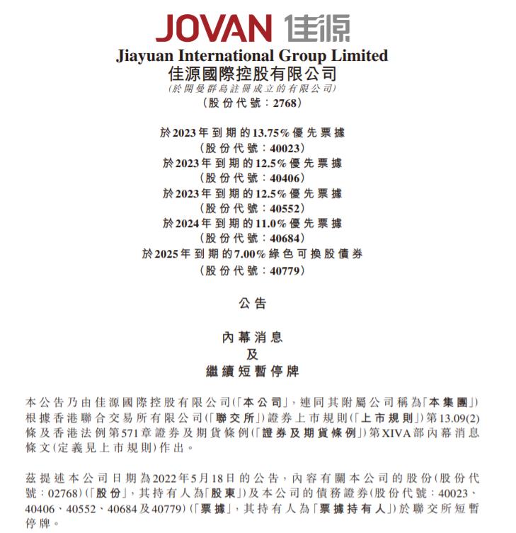 5月23日,佳源國際控股發佈內幕消息及繼續短暫停牌公告。佳源國際表示,由於公司主席兼非執行董事沈天晴質押賬户中的證券價值大幅下跌及未能達到追繳保證金,其持有的1348000股股份於5月18日被一家證券公司在公開市場強制出售。