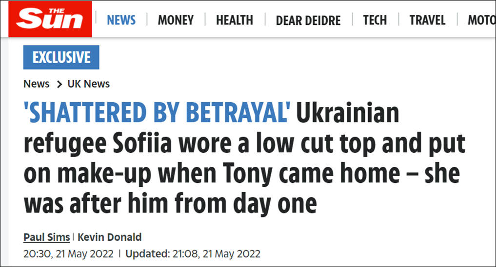 對於在22日如此向英媒控訴的洛娜來説,收留烏克蘭難民索菲亞是她不幸的開端。因為就在洛娜和她的伴侶託尼歡迎索菲亞進入他們家的10天后,與洛娜育有兩個孩子的託尼,就拋棄了相戀8年的洛娜與孩子們,與索菲亞一起離開了……