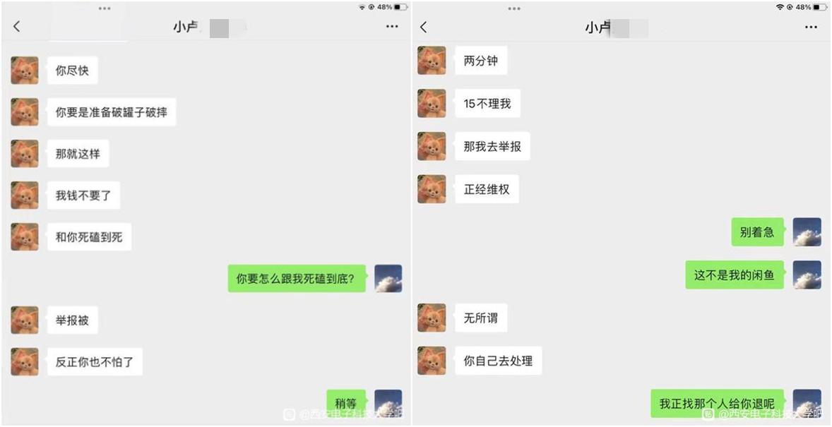 據槍手稱,這2名學生在下單後頻頻加需求,但從未提過加錢。在該槍手盡力滿足他們的需求後,他們又利用閒魚平台不支持代碼類商品交易的漏洞,以槍手沒滿足某項需求和沒有做到秒回消息為由,威脅向平台舉報該槍手,甚至反過來跟槍手要錢,以減少訂單價格。
