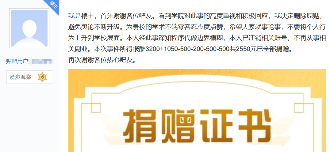 另外,該槍手也在今日對此事進行回應。槍手錶示,他已看到學院對此事的高度重視和積極回應,因此決定刪除原貼,避免輿論不斷升級。槍手還稱其已註銷相關賬號,今後不再從事相關副業,並已將本次代做所得2550元報酬全部捐贈。