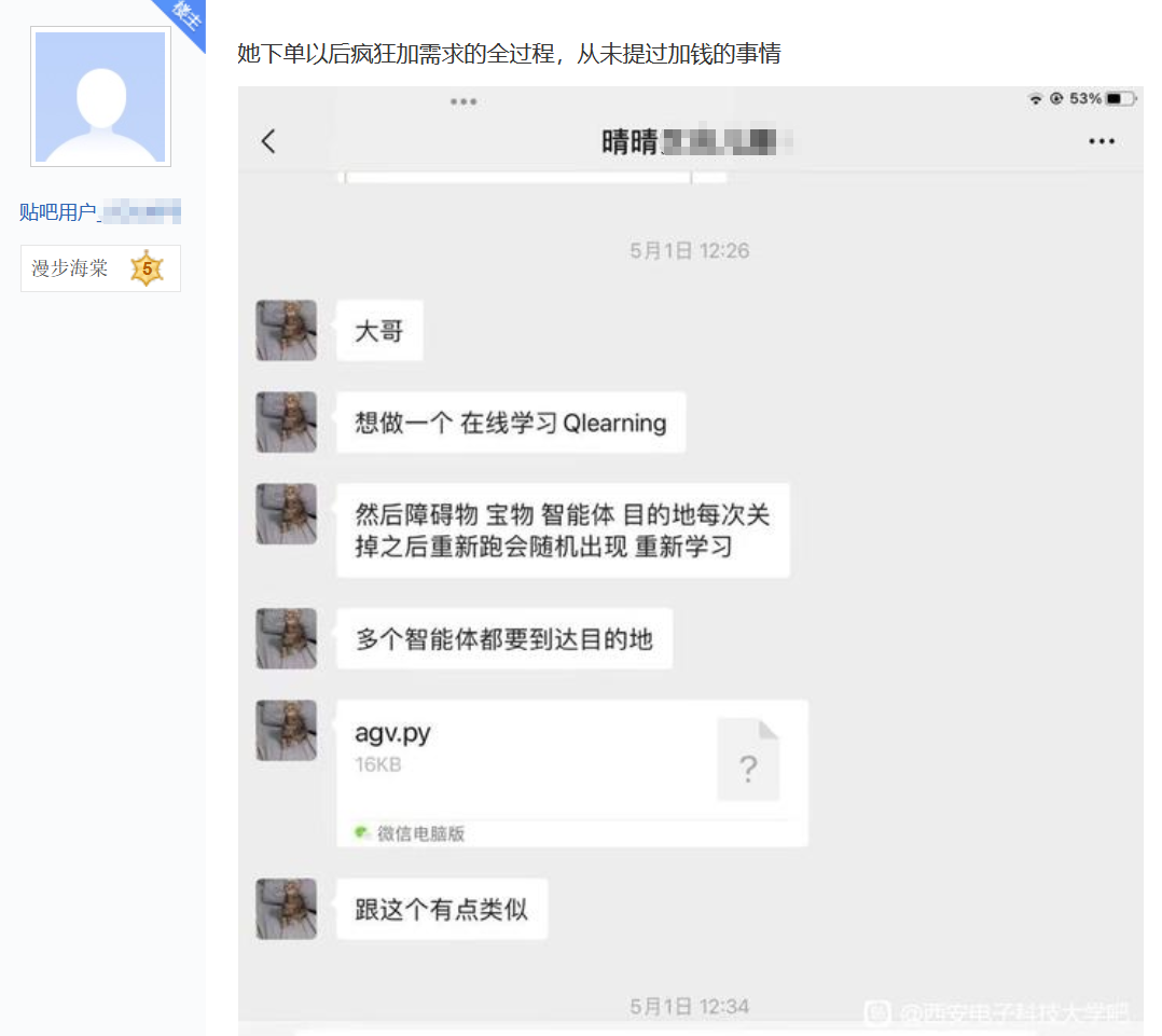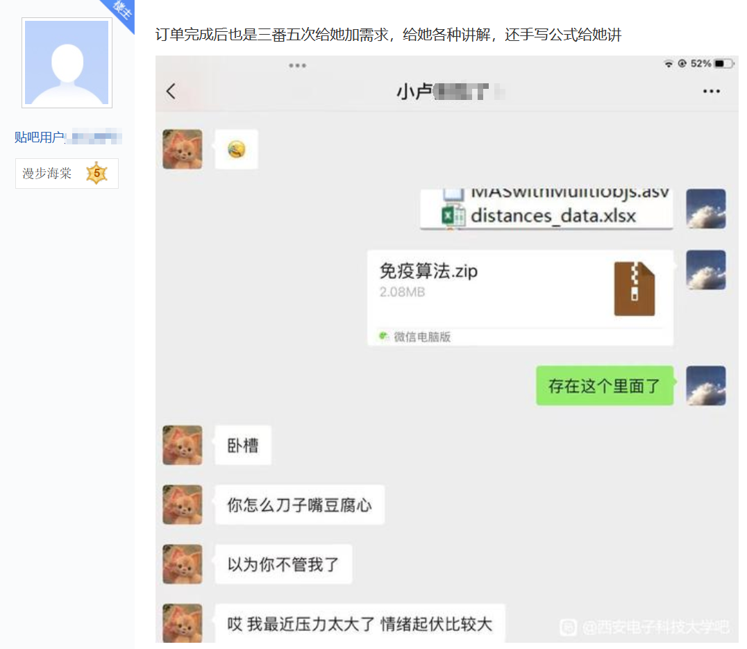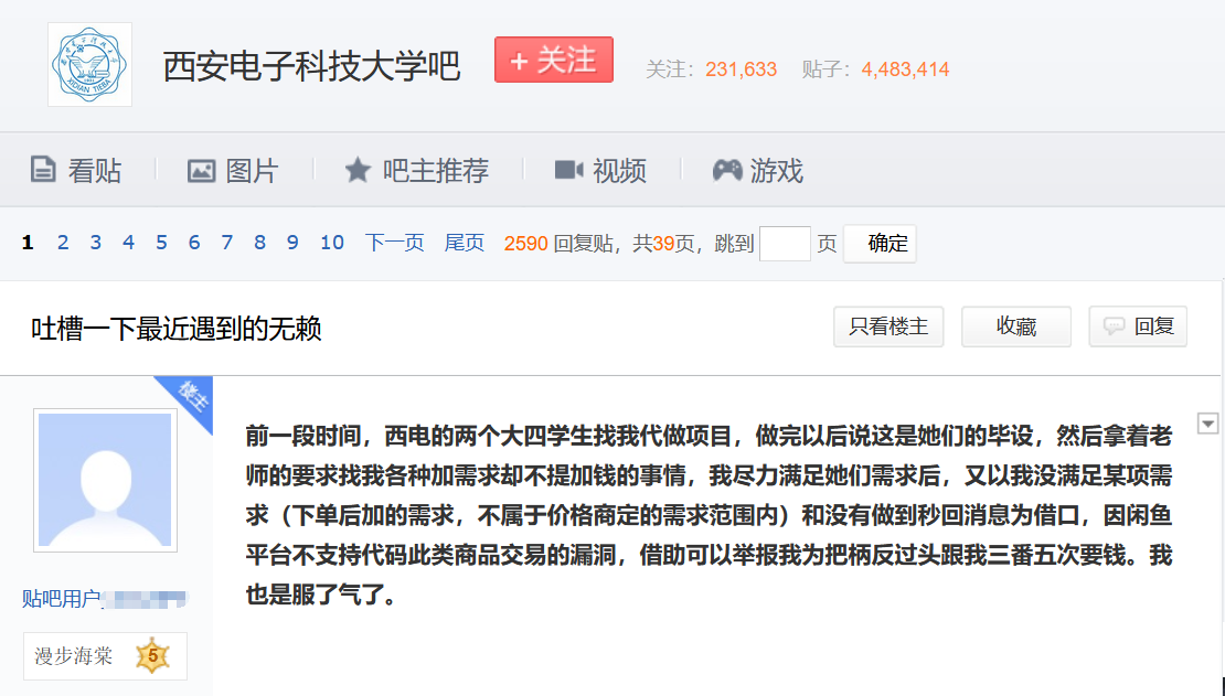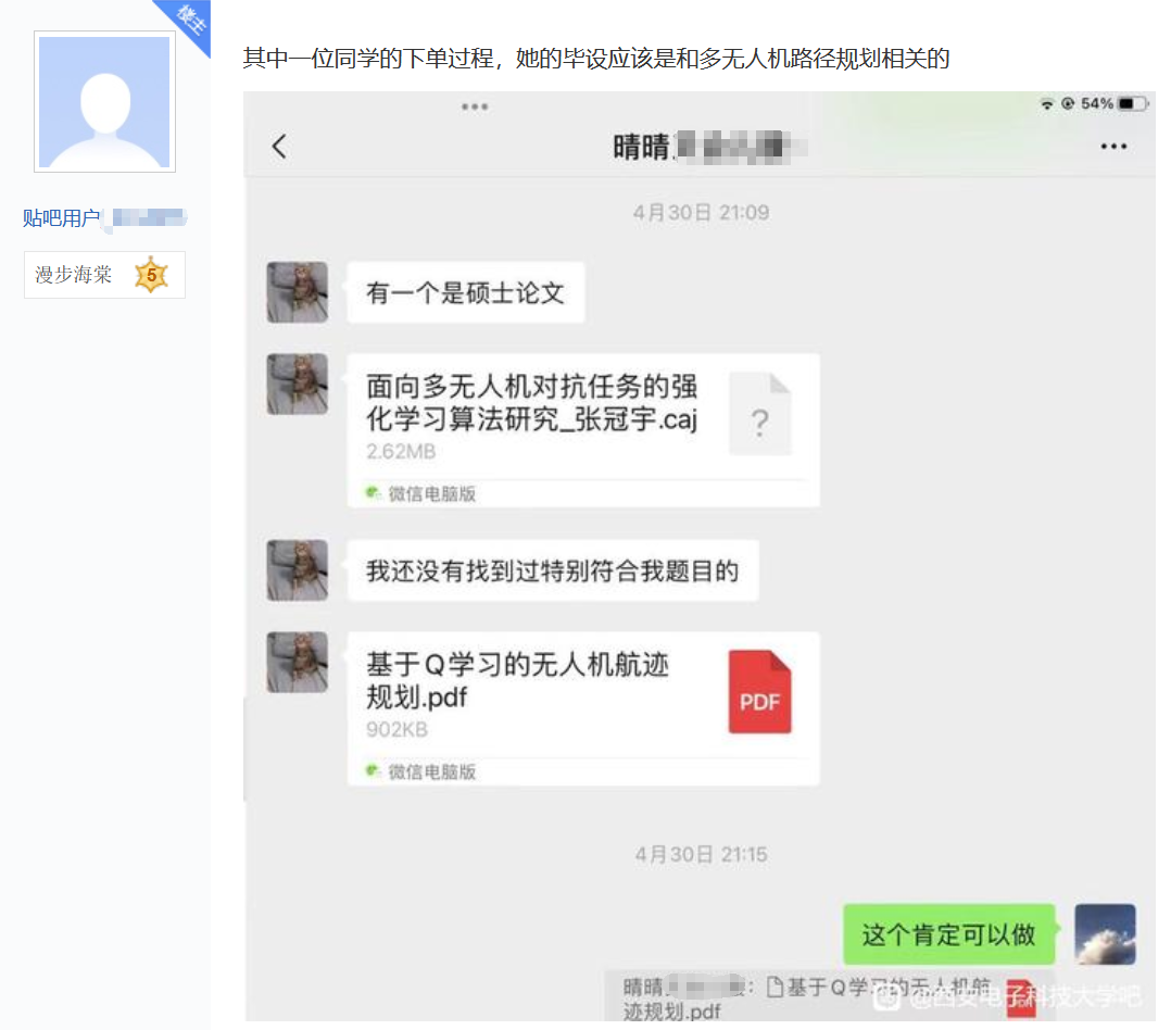 22日,槍手在貼吧發帖曝光西安電子科技大學2名學生在平台上找其代做畢業設計