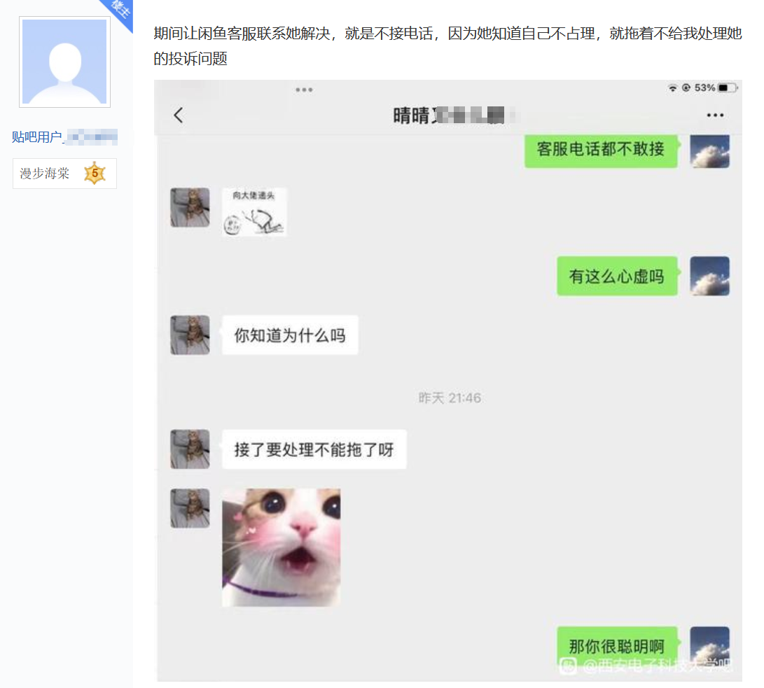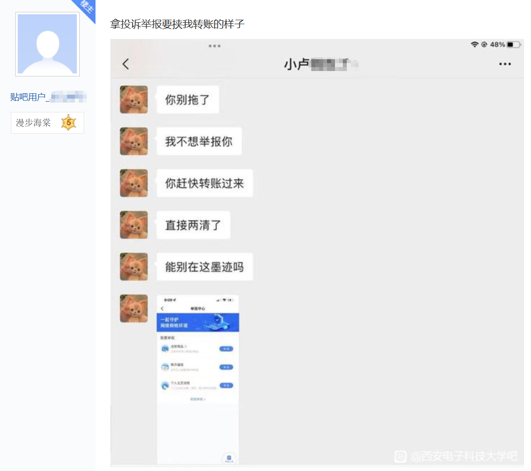22日上午,該槍手以“吐槽一下最近遇到的無賴”為題,在“西安電子科技大學吧”連發十幾條帖文,曝光此事。