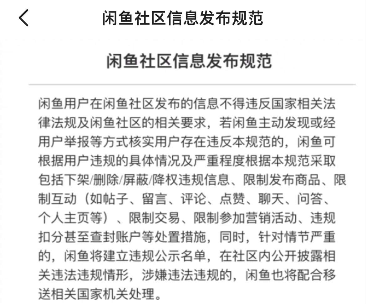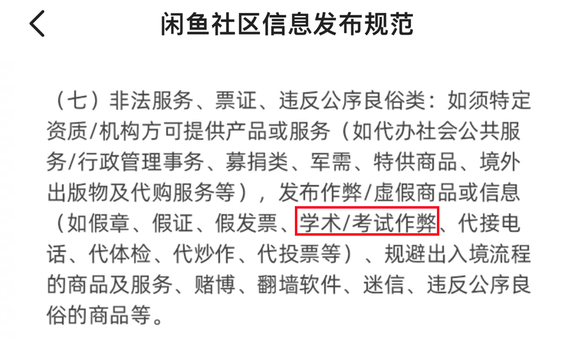 需要一提的是,根據《閒魚社區信息發佈規範》,禁止發佈類就包括“學術作弊”。若閒魚主動發現或經用户舉報等方式核實用户存在違反規範的,閒魚可根據用户違規的具體情況及嚴重程度,根據本規範採取包括下架/刪除/屏蔽/降權違規信息、限制發佈商品、限制互動、限制交易、限制參加營銷活動、違規扣分甚至查封賬户等處置措施。因而槍手在兩名學生以向平台舉報的威脅下,同意了轉賬要求。