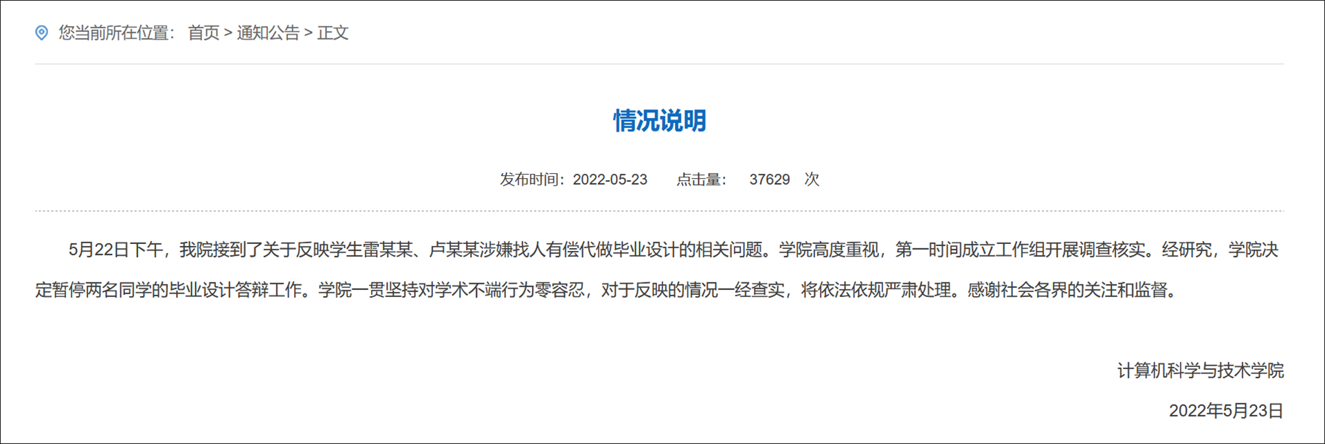 對此,西安電子科技大學計算機科學與技術學院今日發佈情況説明回應此事。該學院稱,5月22日下午,該院接到了關於反映學生雷某某、盧某某涉嫌找人有償代做畢業設計的相關問題。學院高度重視,第一時間成立工作組開展調查核實。經研究,學院決定暫停兩名同學的畢業設計答辯工作。該學院還表示,學院一貫堅持對學術不端行為零容忍,對於反映的情況一經查實,將依法依規嚴肅處理。