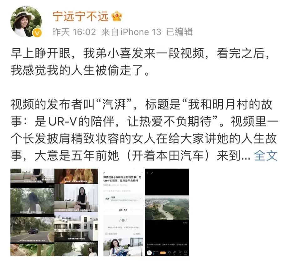 寧遠在微博中提到,今年4月,視頻號“汽湃”發佈了一則《我和明月村的故事:是UR-V的陪伴,讓熱愛不負期待”》的視頻,時長5分30秒。視頻中一名東風本田UR-V的車主,講述她在五年前第一次來到成都蒲江明月村,被村裏淳樸的民風吸引而留下來做草木染的經歷。取景場地全部在明月村,其中百分之八十以上在遠家,百分之二十是前述車主和本田汽車以及明月村的畫面。