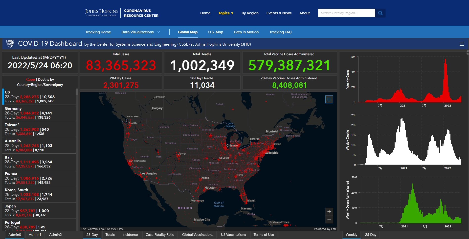 (觀察者網訊)根據美國約翰斯·霍普金斯大學統計數據,截至北京時間5月24日6時20分,美國新冠肺炎累計感染病例達到83365323例,累計死亡病例達到1002349例。在過去約24小時裏,美國新增感染病例83994例,新增死亡病例176例。