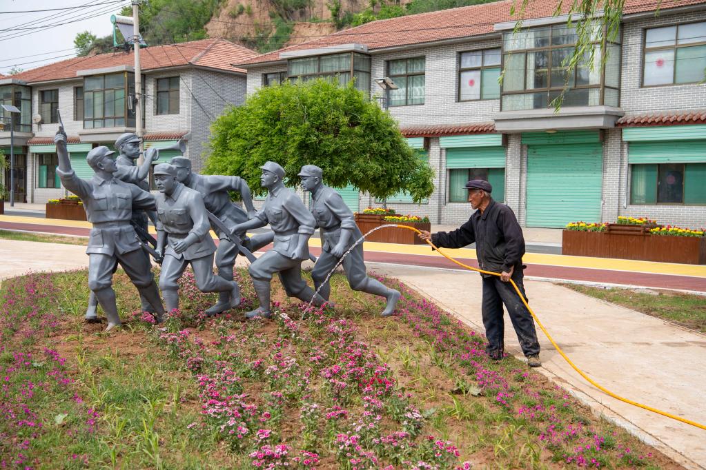 5月18日,在山西省長治市武鄉縣王家峪村,村民胡樹青在為村裏的植被澆水。新華社記者楊晨光攝