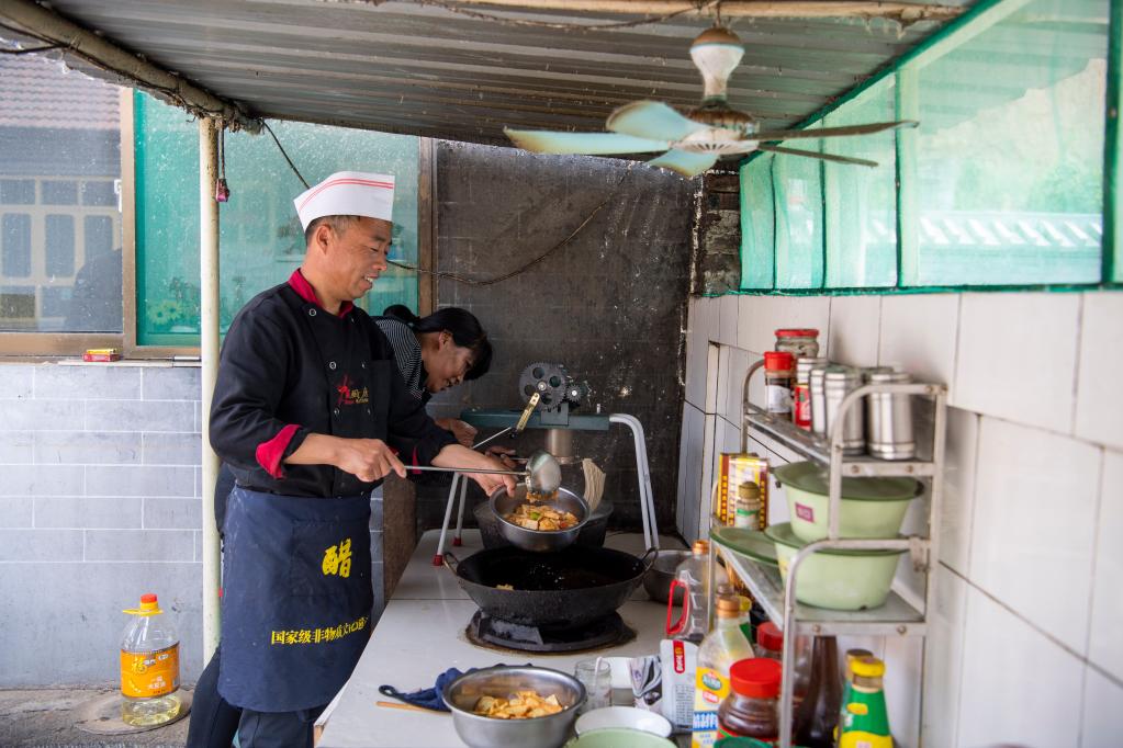 5月18日,在山西省長治市武鄉縣磚壁村,村民張國兵(左)在自家的農家樂裏為客人準備飯菜。新華社記者楊晨光攝