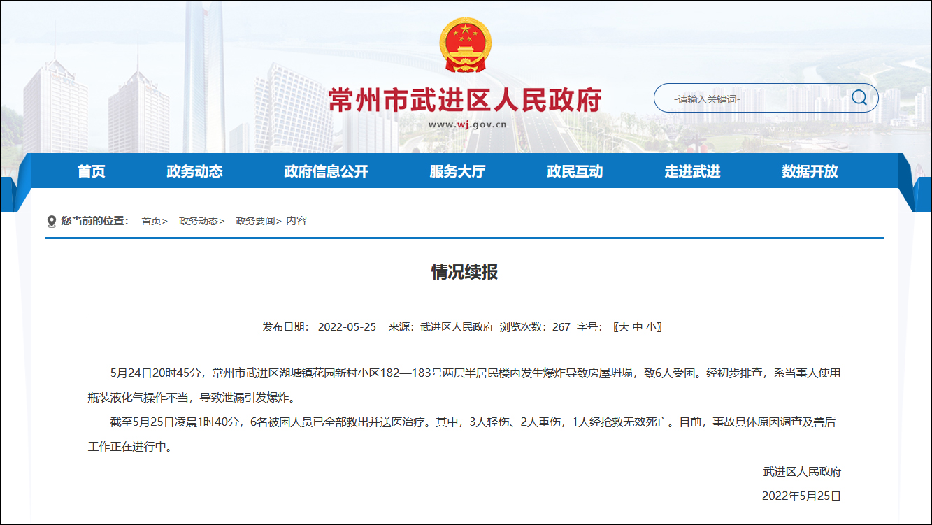 常州一居民樓爆炸致1死5傷:瓶裝液化氣操作不當導致泄露