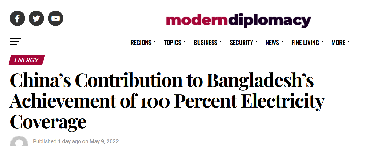 5月9日,歐洲《現代外交》網站(ModernDiplomacy.Eu)刊登一篇題為《中國為孟加拉國實現電力全覆蓋做出貢獻》的文章。