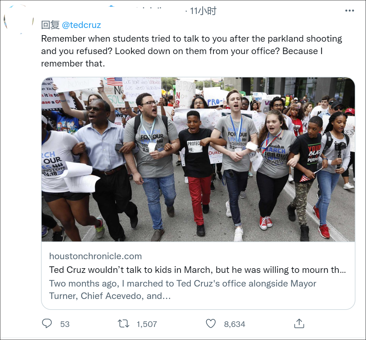 有網民跟克魯茲翻起了“舊賬”。她分享了一則關於2018年佛羅里達州發生大規模校園槍擊案後,克魯茲拒絕與抗議學生溝通的報道,並寫道“還記得槍擊案發生後,學生們想要找你對話,但被你拒絕了嗎?還記得你在辦公室裏俯視着他們嗎?因為我記得這些。”