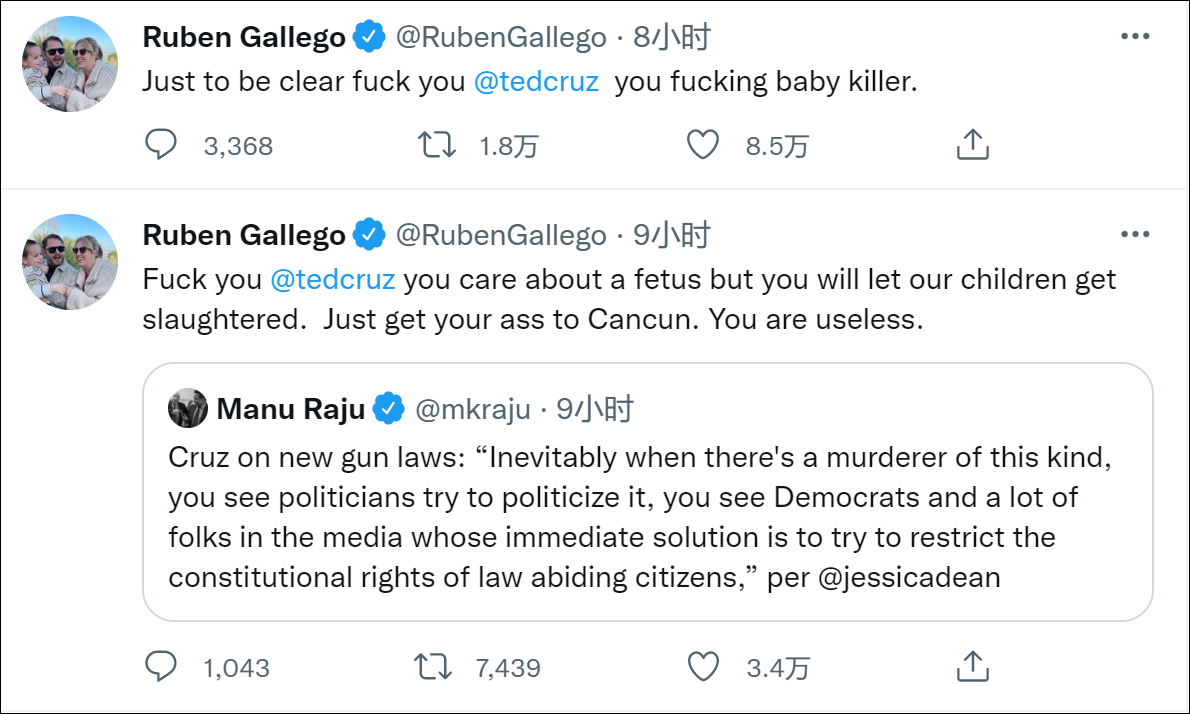 來自亞利桑那州的民主黨眾議員魯本·加列戈(Ruben Gallego)在自己的個人推特賬户上寫道:“去你X的@特德·克魯茲,你關心胚胎(指反對墮胎),但你會讓我們的孩子被屠殺。趕緊滾去坎昆吧。你真沒用。”