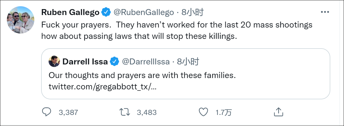 魯本·加列戈接着還轉發了另一位共和黨籍眾議員達雷爾·伊薩 (Darrell Issa)的“祈禱”推文,稱:“你們這些祈禱者,去你X的。他們在最近20起大規模槍擊案中沒有起到任何作用,為什麼不通過能夠阻止這些殺戮的法律呢?”