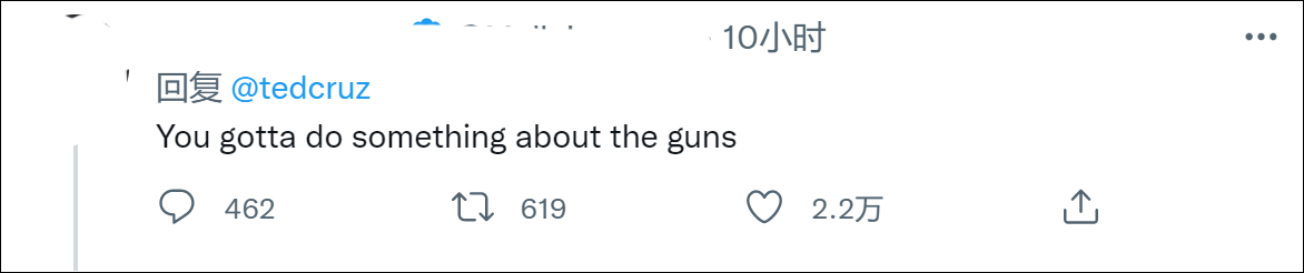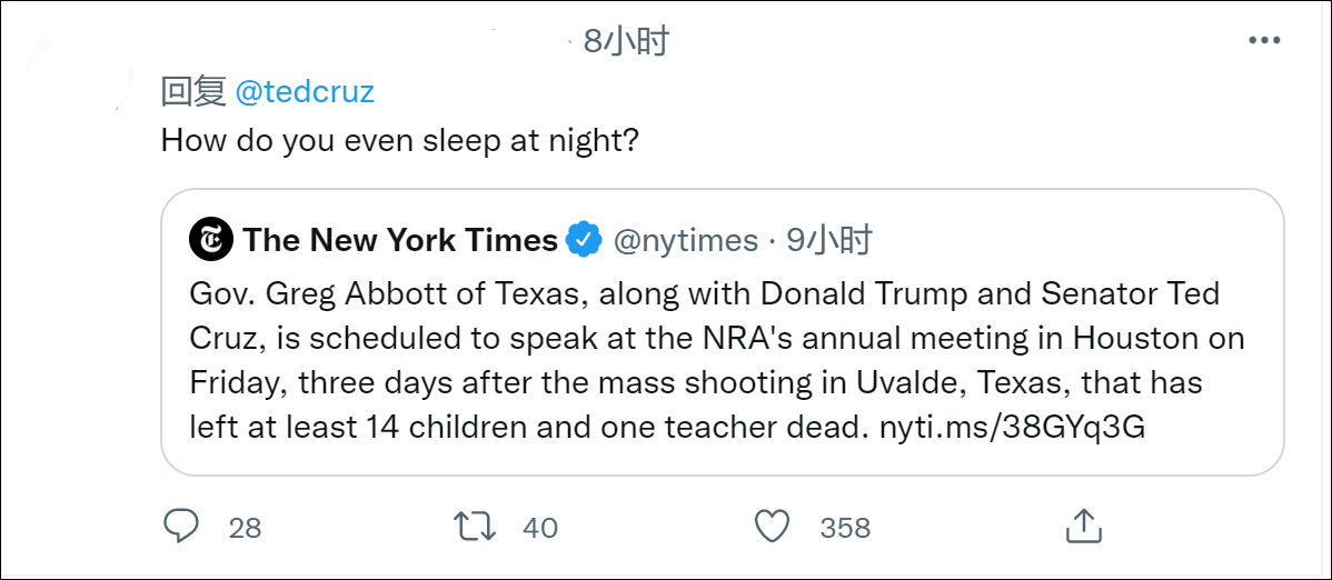 還有評論分享了一則《紐約時報》的報道,然後質問克魯茲:你晚上怎麼能睡得着覺?這則報道稱,參議員克魯茲將與得克薩斯州州長格雷格·阿博特及前總統特朗普,一起參加定於27日在休斯頓舉行的“全國步槍協會”年度會議並發表講話,也就是槍擊案3天后。