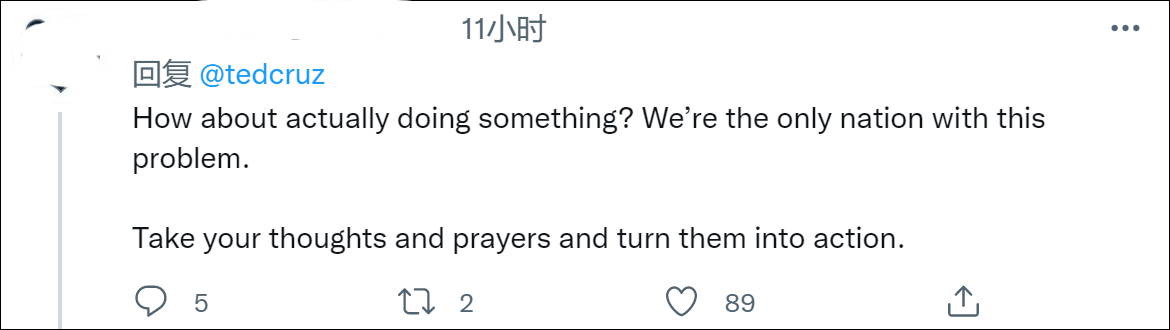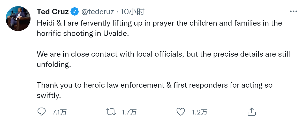 這起大規模校園槍擊案發生後,克魯茲迅速在推特上發聲。他表示自己和妻子正在為尤瓦爾迪市這起可怕槍擊事件中的孩子和家人祈禱,“我們正與當地官員保持密切聯繫,但具體細節仍在披露中。感謝英勇的執法人員和一線救援人員如此迅速地採取行動”。
