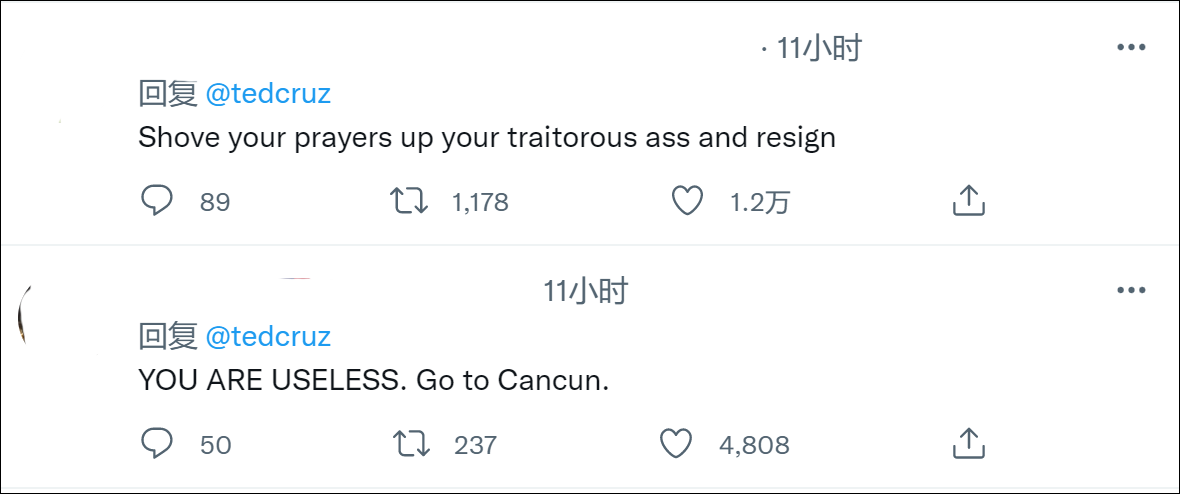 而有些評論則直接“開懟”。“那些祈禱留給你自己吧,叛徒,辭職!”“廢物,滾去坎昆吧!”(去年得克薩斯州居民遭受暴風雪和斷水斷電時,克魯茲一家人被爆乘飛機前往墨西哥坎昆度假)