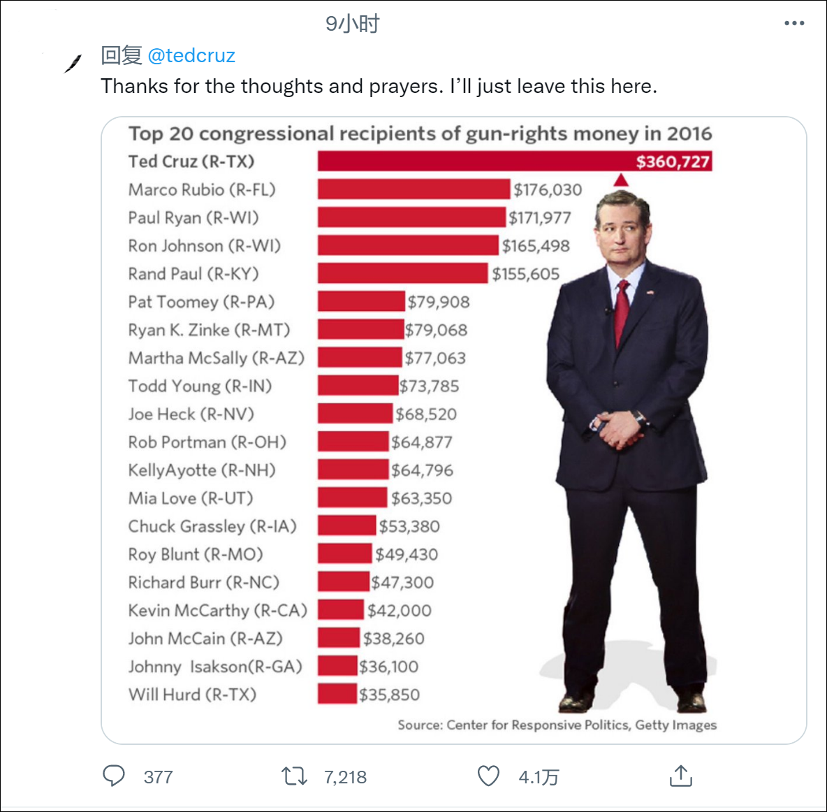 一條排名最高、點贊及跟帖最多的評論諷刺地寫道:“謝謝你的心意和祈禱,我只把它(一張圖表)放在這兒。”推文列出的圖表是2016年從“擁槍組織”得到資金支持的前20名國會議員排名表,其中克魯茲以360727美元高居榜首,比排名第二的另一個臭名昭著的反華議員盧比奧(Marco Rubio)多出一倍。